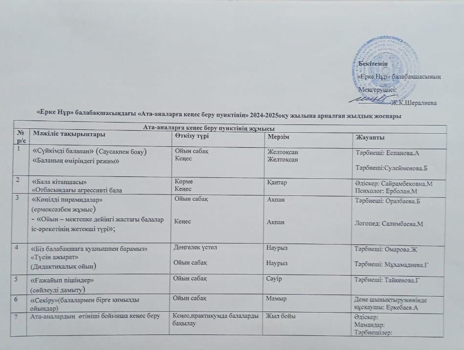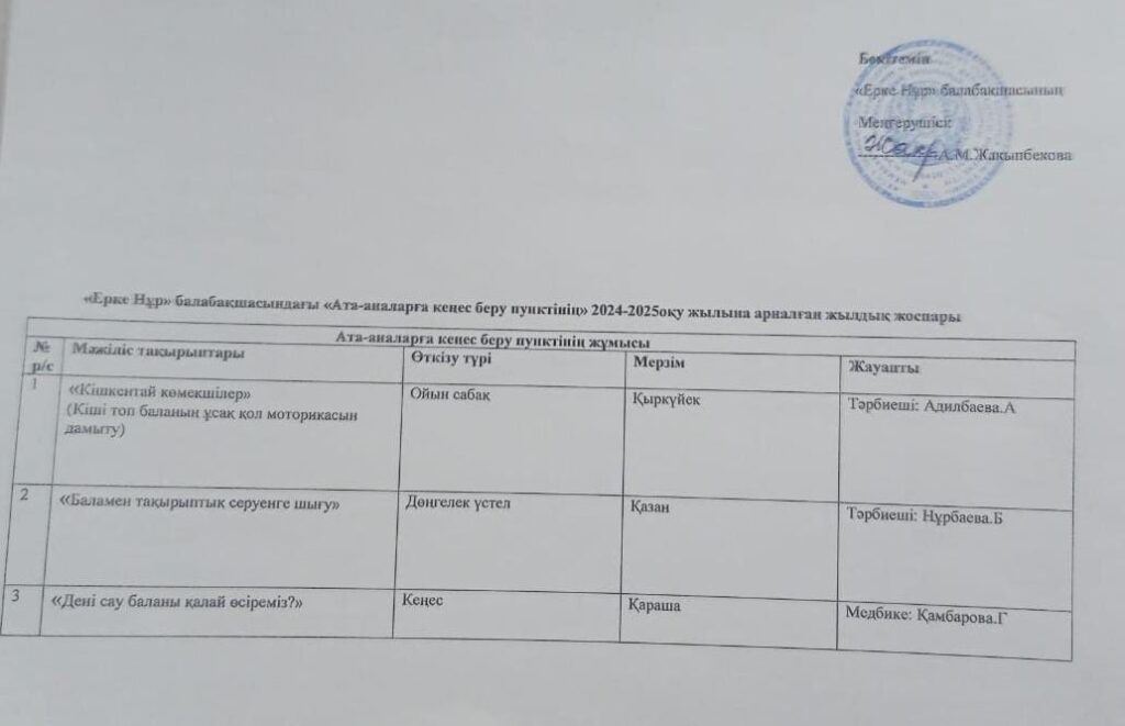 Балабақша медбикесі Г.А.Камбарова қыс мезгіліне байланысты «Жіті респираторлық вирустық инфекция (ЖРВИ),тұмау, оның алдын алу шаралары туралы кеңес беруде.Ата-аналарға педагогикалық-психологиялық кеңес беру пункттінің 2024-2025 оқу жылына арналған жұмыс жоспарыБалабақша тәрбиешілері балалармен дидактикалық,логикалық,үстел үсті ойындарын ұйымдастырды.Әдіскер М.С.Сайрамбекова «Менің көмекшілерім» атты жұмысын ұйымдастырды
